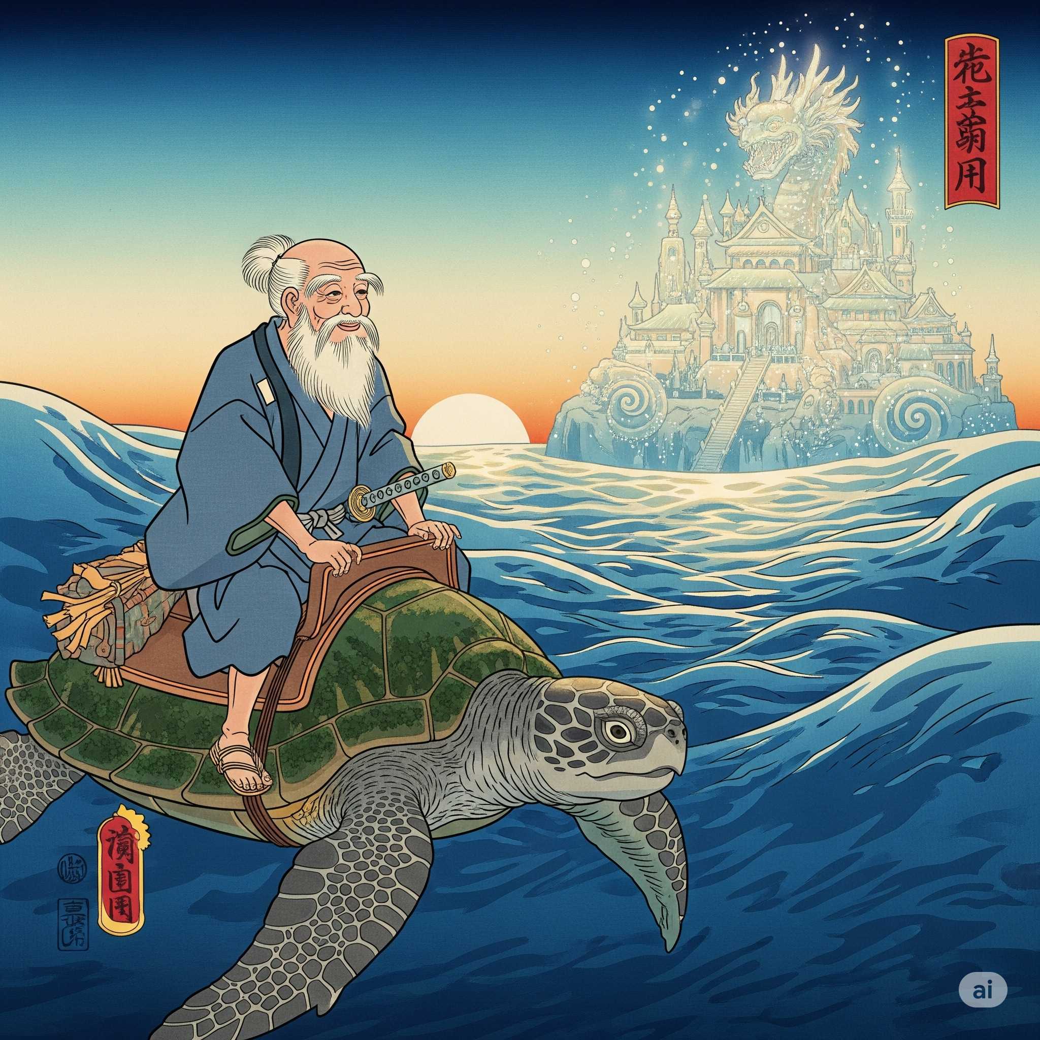 【お題】亀に乗って竜宮城を訪れる谷口雅春師似のご老人
